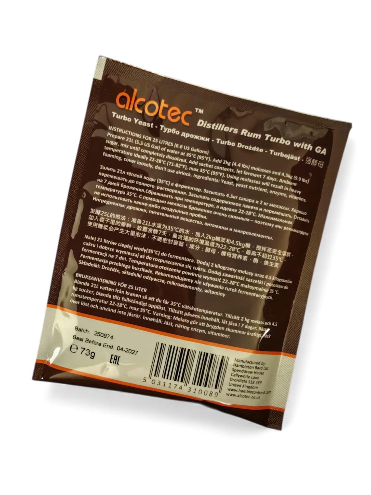 Alcotec Rum Turbo Yeast contains both the yeast strain to best promote the fine flavours from your raw materials and the enzyme needed. For grain or molasses based recipes, we have added a GA (glucoamylase) enzyme which breaks down dextrins which are leftovers from the raw materials after fermentation. For grain based recipes, you also need to pre-treat the wash with Alcotec Alpha Amylase Enzyme. Available in 73g sachets (108g for Australia/NZ), suitable for 25 litre fermentations.