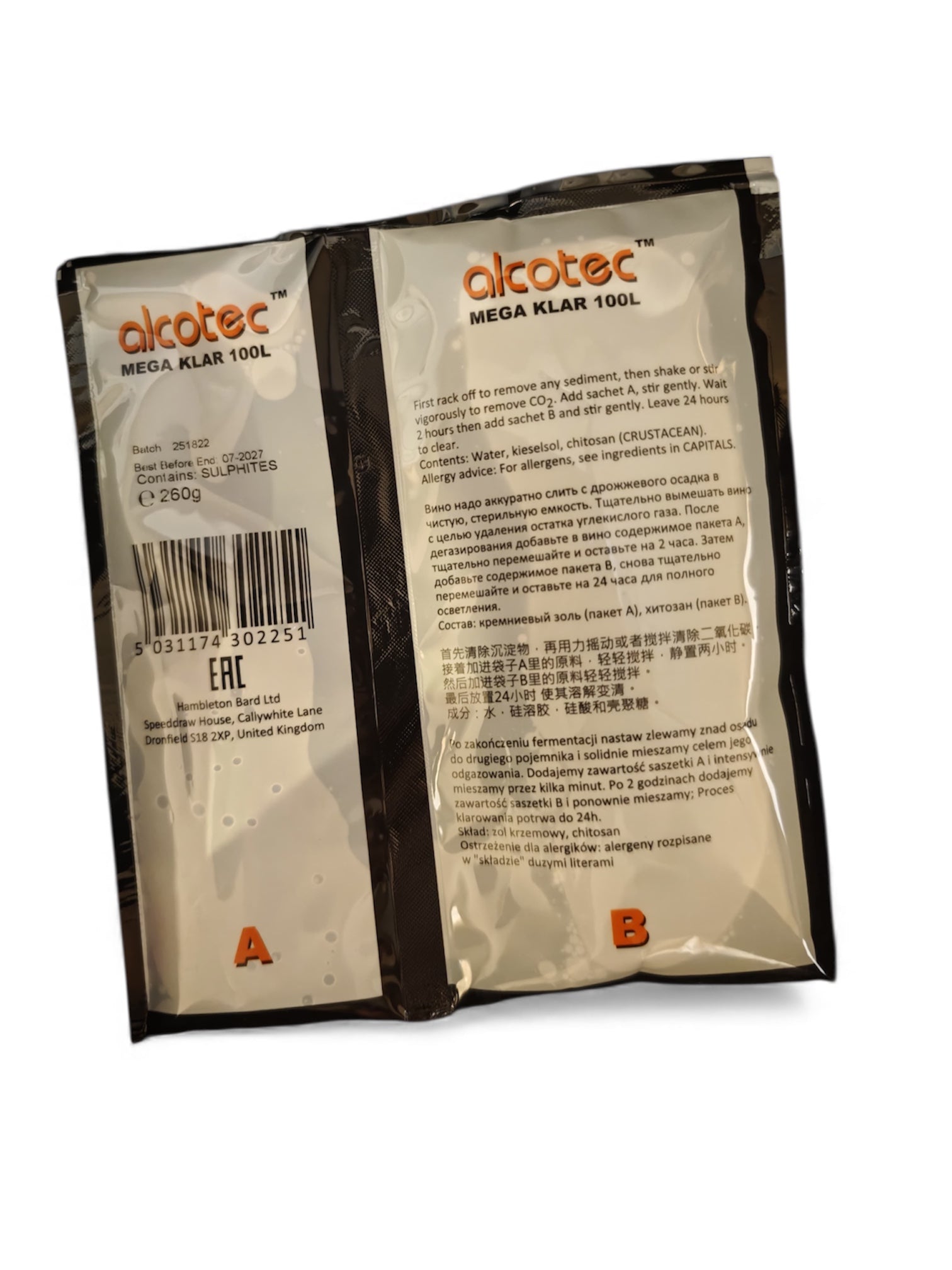 Alcotec Mega Klar 100L 24hr Finings. 260g for clearing 100L Homebrew Turbo, Wine, Beer, Cider.